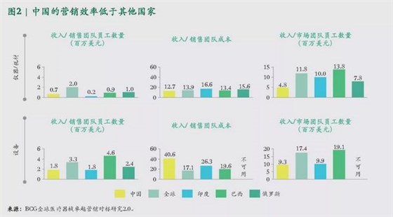 另一方面,我國營銷效率低的現狀也急需改變。根據BCG數據顯示,中國醫療儀器/耗材的營銷效率低于全球平均水平,甚至低于市場也在不斷增長但成熟度更低的其他金磚國家,尤其是印度。